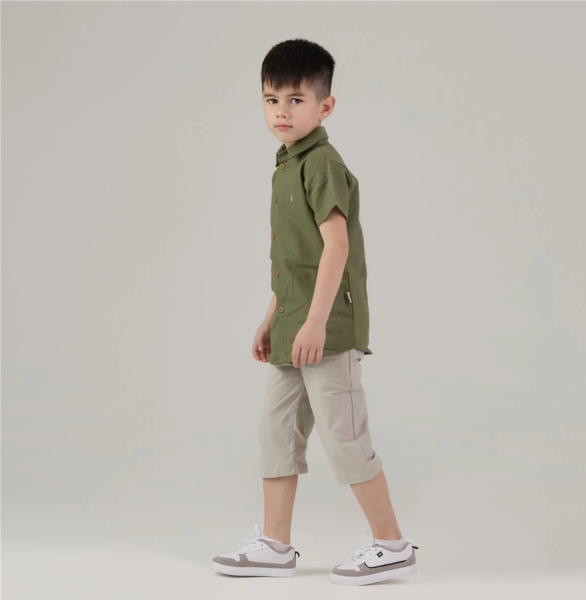 A Camisa Raio de Sol é ideal para meninos que gostam de unir estilo e conforto. Confeccionada em linho com elastano (84,8% viscose 10,9% lino e 4,3% elastano), esta peça oferece um toque leve e natural, com a flexibilidade necessária para acompanhar cada movimento. Seu design de mangá curto e corte moderno traz frescor e elegância, perfeito para dias especiais ou momentos casuais. A Camisa Raio de Sol é versátil e sofisticada, pronta para compor looks encantadores.
