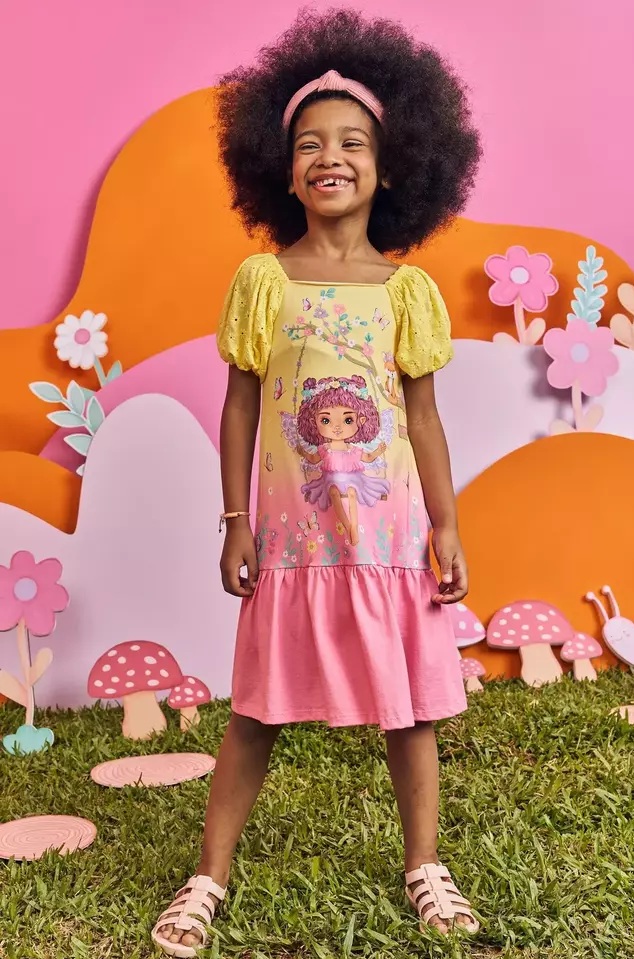 Vestido Infantil em Meia Malha - degrade em Amarelo/Rosa/Estampa - Kukie